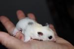 Sassy Frass (GM)OOP Date : 08/24/2014 Color : Mosaic Genetics : Sassy is a rare Piebald Mosaic. She is white with one small black spot on her back and black ears. Her twin sister is a white Mosaic with black ears. Her mom is a Powered out, White Face Mosaic , and dad is a White Face Leu Het Male from proven heterozygo Remarks : Sassy is a rare Piebald Mosaic. Her twin sister is a white mosaic with black ears. |