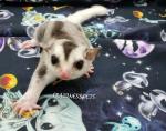 Kessa(Treasured Gliders)OOP Date : 06/22/2016 Color : Mosaic Genetics : 12.5% leu het/possible wf Remarks : Pure white mosaic/Strong pied lines. Some siblings have gone on to produce wow pied and pied marked joeys. |